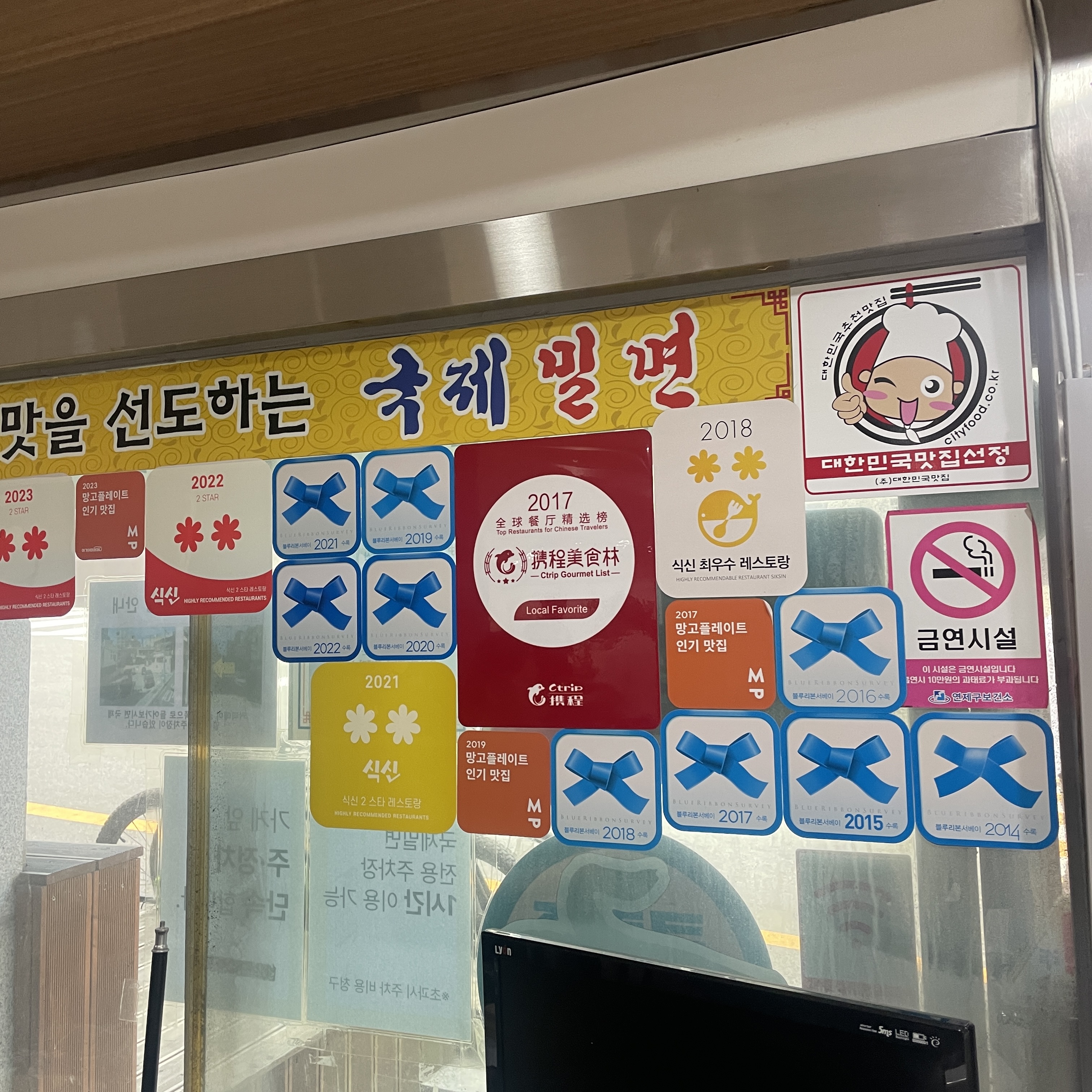 가게에 들어서자마자 블루리본, 대한민국 맛집선정등 많은 맛집인증 스티커가 붙어있습니다.